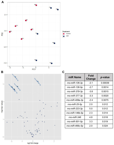Transcriptional regulation is modulated by FPF treatment. MicroRNA profiling was performed on flash-frozen wound tissues using LNA-enhanced, SYBR Green based miRNA qPCR. (A) Principal component analysis (PCA) showing the distance and relatedness between samples with miRs having the largest coefficient of variation. (B) Volcano plot showing the relationship between p-values and fold change in normalized expression between control and FPF-treated groups. (C) Most differentially expressed known miRs with fold change (FC) between control and FPF-treated groups (N = 6/group).