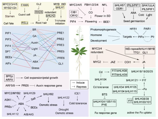 Under specific conditions, multiple phytohormones and environmental factors are in constant crosstalk with each other to affect the plant growth and development. Based on previous studies, GA, IAA, BR, ET and light are usually considered to promote cell expansion in plant growth, while ABA, JA and SA are normally involved in the response to biotic and abiotic stresses. bHLH proteins that respond to plant hormones and environmental factors participate in various processes. They are able to interact with each other to cooperatively or antagonistically modulate the plant growth.