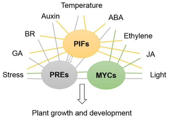 Some transcription factors play the more crucial roles in many aspects of plant development, such as MYCs, PREs and PIFs, and these bHLHs are key transcriptional regulators in the phytohormone crosstalk pathway and multiple biosynthesis pathways. As JAZ targets, MYCs are involved in JA-mediated gene expression and the ABA signaling pathway; they also mediate ET biosynthesis and regulate stamen development and flowering time. PREs respond to GA, BR, temperature and light signaling to positively regulate cell elongation. PIFs are also involved in many other signaling pathways, such as in mediating pathways responsive to light, GA, IAA, ABA, ET and abiotic/biotic stress [73,149,150] (Figure 2).