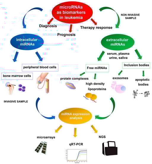 Schematic representation of miRNA employment as biomarkers in leukemia, based on invasive and non-invasive approaches for expression analysis.