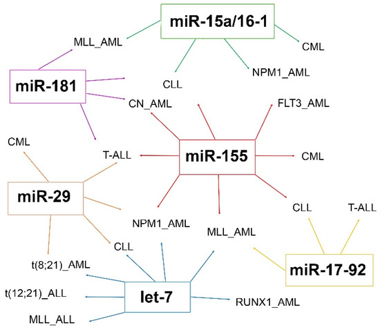 Different studies reported specific miRNA expression profiles that distinguish between AML and acute lymphoblastic leukemia (ALL), some miRNAs being reported in different studies, such as miR-23a, miR-27a/b, miR-128a, miR-128b, miR-221, miR-222, miR-223, and let-7b [105,106]. In a study by Mi et al., four miRNAs were sufficient to distinguish between AML and ALL with an accuracy of greater than 95%, as let-7b/miR-223 being significantly upregulated and miR-128a/miR-128b downregulated in AML comparing to ALL [105]. Together, the above work showed that these identified miRNAs could be new potential markers for ALL and AML classification and diagnosis [62].