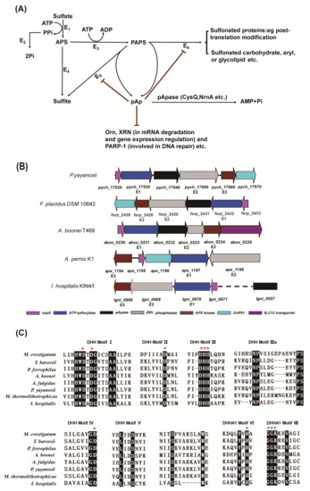 A gene cluster involved in assimilatory sulfate reduction exists in the genome of some strains from Euryarchaeota and Crenarchaeota, including T. onnurineus NA1 [27] and P. yayanosii (Figure 1A). The intact gene cluster consists of five genes, pych_17520 to pych_17560, in P. yayanosii (Figure 1B). PYCH_17520 is a putative copG transcription factor and potentially regulates the pathway of assimilatory sulfate reduction. PYCH_17530 and PYCH_17560 are ATP sulfurylase and APS kinase, respectively, and work together to generate the PAPS. PYCH_17540 and PYCH_17550 are annotated as DHH phosphoesterase and type I phosphodiesterase/nucleotide pyrophosphatase, respectively. It is speculated that PYCH_17540 (pApase) degrades pAp and pApS, and PYCH_17550 degrades PPi, the byproduct of PAPS synthesis.