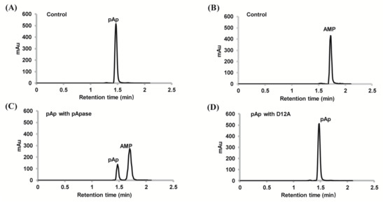 The homolog of PyapApase (PYCH_17540) in T. onnurineus NA1 has been reported to degrade pAp and PAPS [27]; therefore, the ability of PyapApase to hydrolyze pAp was first characterized. Wild-type (wt) PyapApase could efficiently degrade pAp and produce 5′-AMP and Pi, whereas the inactive mutant D12A could not (Figure 2).