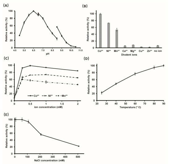 Effect of pH (A), divalent metal ions (B), divalent metal ion concentrations (C), NaCl concentrations (D), and reaction temperature (E) on the activity of PyapApase. Each reaction contains 0.2 mM of pApase and 3.75 nM of pAp. (A) pH-dependent reactions were run with the following buffers (each at 20 mM): MES-NaOH (pH 5–7), Tris-HCl (pH 7–9), and Gly-NaOH (pH 9–11). (B) Divalent metal ions were present at a concentration of 1 mM. (C) Divalent metal ion (Ni2+, Co2+, Mn2+) dependence over a concentration range of 0 to 2 mM. (D) NaCl concentration over a range of 15 to 500 mM. (E) Temperature dependence over a range of 25 to 90 °C. Activities are expressed as percentages of the best condition for each parameter: pH 6.5 (A), Co2+ (B), 0.5 mM Co2+ (C), 50 mM NaCl (D), and 90 °C (E).