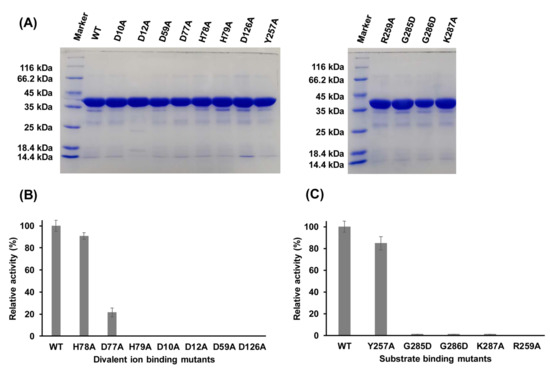 Verification of active sites of PyapApase. (A) Purity of wt and mutated pApases confirmed by 12% SDS-PAGE. (B) Relative activity of mutants involved in divalent ion binding sites. (C) Relative activity of mutants involved in substrate binding. Activities are expressed as percentages of the activity of wild-type pApase. In each reaction, 0.2 mM of pAp was incubated with 3.75 nM of purified proteins at 70 °C for 2 min.