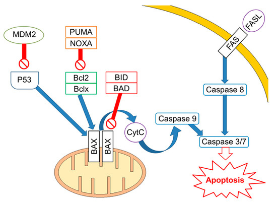 Apoptotic signalling in cisplatin-sensitive Germ Cell Tumours. Apoptosis is regulated at several levels with a key role for TP53, which transcriptionally regulates proteins involved in both the extrinsic and intrinsic apoptosis pathway, including FAS death receptor, BAX, PUMA, and NOXA. Activated TP53 enhances expression of the FAS death receptor. Binding of FAS ligand to FAS death receptor leads to cleavage of procaspase-8 and subsequently activates a caspase cascade leading to apoptosis. The intrinsic apoptosis pathway is regulated by pro- and anti-apoptotic proteins. Pro-apoptotic proteins directly facilitate BAX and BAK oligomerization in the mitochondrial outer membrane, or they indirectly inhibit anti-apoptotic proteins. Crosstalk between the extrinsic and intrinsic apoptosis pathways exists in form of caspase-8-mediated cleavage of BID.