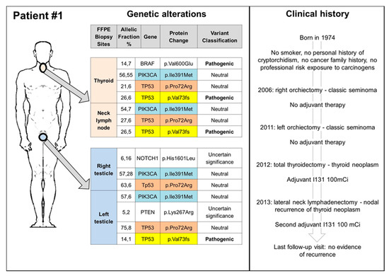 We identified several genetic variants in both types of tumours, some of them neutral or of uncertain significance, as well as three pathogenic mutations confirmed by pyrosequencing in the BRAF, KRAS, and TP53 genes. Figure 2 and Figure 3 summarize the genetic alterations found in our cases. The BRAF V600E mutation was detected in the thyroid tumour of patient 1, while the KRAS G12S in the testicular seminoma of patient 2. The most common neutral/uncertain mutations detected involved the TP53 and PIC3CA genes in both thyroid and testicular cancers. The c.216delC pathogenic mutation, located in coding exon 3 of the TP53 gene, results from a deletion of one nucleotide at nucleotide position 216, causing a translational frameshift with a predicted alternate stop codon (p.V73Wfs*50). This alteration is expected to result in loss of function by premature protein truncation or nonsense-mediated mRNA decay. As such, this alteration is interpreted as a disease-causing mutation and has been found in thyroid, node, and left testicular cancers of patient 1 and in TC of patient 2.