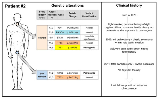 Since the elevated risk of thyroid cancer (TC), reported for the surgery only group in the study by Hellesnes et al. [21], is a novel finding that needs to be further investigated, we carried on a database search of TGCT patients, referred to the Rare Tumors Reference Center of Campania Region between 2000 and 2019, who received a TC diagnosis. Finally, we identified two patients, who received a diagnosis of TGCT and metachronous TC (Figure 2 and Figure 3). Both patients had no family cancer history that was suspicious for hereditary cancer predisposing syndrome or professional exposure. The first patient had a history of metachronous bilateral stage I seminoma, managed with surveillance (surgery only) and a subsequent diagnosis of papillary thyroid cancer (PTC), 6 years from the first TGCT diagnosis and 1 year after the second one (Figure 2). The second patient had a history of left cryptorchidism and a diagnosis of stage I right-sided seminoma treated with radiotherapy in an adjuvant setting. He received a diagnosis of follicular thyroid cancer (FTC) 5 years after the end of treatment (Figure 3). Both patients are still alive and free of disease relapse (clinical details are reported in Figure 2 and Figure 3). Biopsy tissue samples of TGCT, TC, and, for the first case, also tissue sample from neck lymph node, were collected and analysed for somatic mutation analysis (Methods section is provided in the supplementary). At the time of this analysis, both patients, in absence of a suspicious cancer family history, refused germ-line testing.