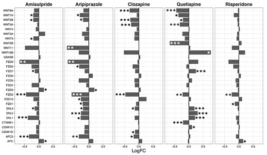 Wnt signaling pathway genes regulated by psychotropic drug treatment in NT2-N cells expressed as log fold change relative to vehicle-treated cells. * p < 0.05, ** p < 0.005, and *** p < 0.001.