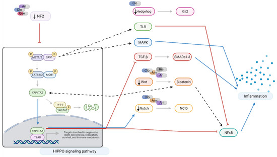 The downregulation of NF2 and WWC1 observed following treatment with aripiprazole and clozapine could lead to YAP/TAZ nuclear translocation and its non-canonical activities: inhibition of TGF-β signaling [30,31] and modulation of the activity of the Wnt and Notch pathways [32,33]. YAP/TAZ activation is also associated with reduced activity of NFκB and pro-inflammatory cytokine production. This appears to be mediated by the inhibition of proteins and enzymes involved in downstream signaling cascades following pattern-recognition receptors (PPRs) activation [34,35] (reviewed [36]).