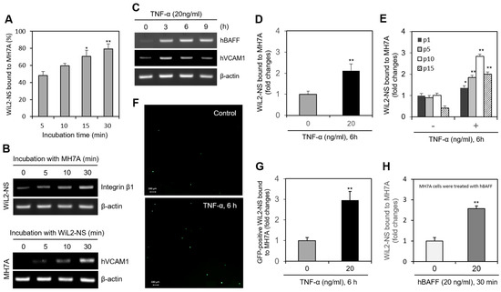 TNF-α enhanced a binding of B cells to synovial cells. (A,B) MH7A cells were plated overnight. Then, WiL2-NS cells were added and co-incubated to adhere for 5, 10, 15 and 30 min (A). Each cell was collected separately at each time point. RNA was purified with Nucleozol®. The expression of human vascular cell adhesion molecule-1 (hVCAM1) and integrin β1 in MH7A and WiL2-NS cells was respectively detected by RT-PCR (B). (C) Primary synoviocytes were treated with 20 ng/mL TNF-α for various times. RNA was purified with Nucleozol®. The expression of hBAFF and hVCAM1 was detected by RT-PCR. (D,E) MH7A cells were plated overnight and treated with 20 ng/mL TNF-α for 6 h. Then, WiL2-NS cells were added and co-incubated to adhere for 30 min. Unbound WiL2-NS B cells were washed out and MTT assay was used to analyze bound B cells (D). WiL2-NS cell adhesion to MH7A cells of each passage were measured by MTT assay (E). (F,G) WiL2-NS cells were transfected with pSG5-GFP plasmid DNA by using Viafect®. GFP-positive WiL2-NS cells were visualized under fluorescence microscope (F). Transfected WiL2-NS cells were co-incubated with MH7A cells at the ratio of 1:1 for 30 min. Unbound WiL2-NS B cells were washed out. Then, GFP-positive WiL2-NS cells were counted to analyze bound B cells (G). (H) MH7A cells were treated with hBAFF protein for 30 min. Then, WiL2-NS cells were added and co-incubated to adhere for 30 min. Unbound WiL2-NS B cells were washed out and MTT assay was used to analyze bound B cells. Each experiment was performed at least four times. Data in a bar graph represent the means ± SD. * p < 0.05, ** p < 0.01; significantly different from group with 5 min-incubation (A), TNF-α- (D,E,G) or hBAFF- (H) untreated control group.
