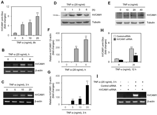TNF-α increased human vascular cell adhesion molecule-1 (hVCAM1) expression. (A) MH7A cells were transfected with pEZx-PG02-hVCAM1-gaussia luciferase (Gluc) plasmid DNA using polyethylenimine (PEI), and treated with various concentrations of TNF-α. Gluc activity was measured by using luminometer. (B–G) MH7A cells treated with 20 ng/mL TNF-α for various times (B,D,F). hVCAM1 expression was detected by RT-PCR (B,C) or real-time Q-PCR (F,G). Cell lysates were prepared and hVCAM1 protein level was detected by western blot analysis (D,E). (H,I) MH7A cells were transfected with control or hVCAM1-siRNA to knockdown hVCAM1 expression by using Lipofectamine®. Then, cells were transfected with pEZx-PG02-hVCAM1-Gluc plasmid DNA by using PEI, and treated with 20 ng/mL TNF-α. Gluc activity was measured by using luminometer (H). RNA was purified with Nucleozol®. hVCAM1 expression was detected by RT-PCR (I). Each experiment was performed at least four times. Data in a bar graphs represent the means ± SD. * p < 0.05, ** p < 0.01; significantly different from TNF-α-untreated (A,F,G). or control siRNA-treated and TNF-α-untreated (H) control group. && p < 0.01; significantly different from control siRNA-treated and TNF-α-treated control group (H).