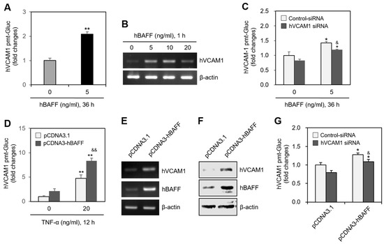 Human vascular cell adhesion molecule-1 (hVCAM1) expression was up-regulated by the treatment or the overexpression of hBAFF. (A) MH7A cells were transfected with pEZx-PG02-hVCAM1-gaussia luciferase (Gluc) plasmid DNA by using polyethylenimine (PEI), and treated with 5 ng/mL hBAFF protein. Gluc activity was measured by using luminometer. (B) MH7A cells were treated with various concentrations of hBAFF protein. RNA was purified with Nucleozol®. hVCAM1 expression was detected by RT-PCR. (C) MH7A cells were transfected with control or hVCAM1-siRNA to knockdown hVCAM1 expression by using Lipofectamine®. Then, cells were transfected with pEZx-PG02-hVCAM1-Gluc plasmid DNA by using PEI and treated with 5 ng/mL hBAFF protein. Gluc activity was measured by using luminometer. (D–F) MH7A cells were co-transfected with pCDNA3.1, or pCDNA3-hBAFF and pEZx-PG02-hVCAM1-Gluc plasmids by using PEI. Gluc activity was measured by using luminometer (D). RNA was purified with Nucleozol®. hVCAM1 expression was detected by RT-PCR (E). Cell lysates were prepared and hVCAM1 protein level was detected by western blot analysis (F). (G) MH7A cells were transfected with control or hVCAM1-siRNA to knockdown hVCAM1 expression by using Lipofectamine®. Then, cells were co-transfected with pCDNA3.1, or pCDNA3-hBAFF and pEZx-PG02-hVCAM1-Gluc plasmid DNA by using PEI. Gluc activity was measured by using luminometer. Each experiment was performed at least four times. Data in a bar graph represent the means ± SD. * p < 0.05, ** p < 0.01; significantly different from hBAFF protein-untreated (A,C) or pCDNA3.1-treated and TNF-α-untreated (D,G) or control group. & p < 0.05, && p < 0.01; significantly different from control-siRNA-treated and hBAFF protein-treated (C) or pCDNA3.1-transfected and TNF-α-treated (D) or control-siRNA-treated and pCDNA3.1-hBAFF-transfected (G) control group.