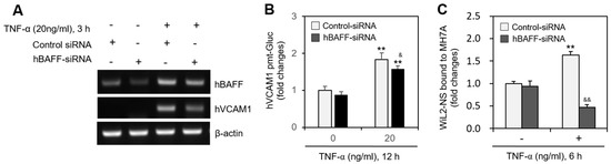 Human vascular cell adhesion molecule-1 (hVCAM1) expression was down-regulated by hBAFF-siRNA. (A–C) MH7A cells were transfected with control or hBAFF-siRNA to knockdown hBAFF expression by using Lipofectamine®. Cells were treated with 20 ng/mL TNF-α. RNA was purified with Nucleozol®. hVCAM1 and hBAFF expression was detected by RT-PCR (A). Cells were transfected with pEZx-PG02-hVCAM1 gaussia luciferase (Gluc) plasmid DNA by using PEI, and treated with 20 ng/mL TNF-α. Gluc activity was measured by using luminometer (B). Cells were treated with 20 ng/mL TNF-α for 6 h. Then, WiL2-NS cells were added and co-incubated to adhere for 30 min. Unbound WiL2-NS B cells were washed out and MTT assay was used to analyze bound B cells (C). Each experiment was performed at least four times. Data in a bar graph represent the means ± SD. ** p < 0.01; significantly different from control-siRNA-treated and TNF-α-untreated control group. & p < 0.01, && p < 0.01; significantly different from control-siRNA-treated and TNF-α-treated control group (A,C).