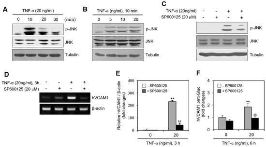 To determine whether a kinase controls hVCAM1 expression, we assessed the levels of various signaling molecules. When MH7A cells were treated with TNF-α, JNK phosphorylation increased significantly for 10 min (Figure 5A) in a dose-dependent manner (Figure 5B). When MH7A cells were treated with TNF-α in the presence of SP600125, a JNK inhibitor both JNK phosphorylation (Figure 5C) and hVCAM1 expression (Figure 5D) were inhibited. The level of hVCAM1 expression in TNF-α-treated cells decreased ~80% in the presence of SP600125, as determined by qPCR (Figure 5E), while the hVCAM1 promoter activity in TNF-α-treated cells decreased ~50%, compared with the SP600125-untreated control (Figure 5F). These data suggest that hVCAM1 expression is regulated by activation of the JNK signaling pathway.