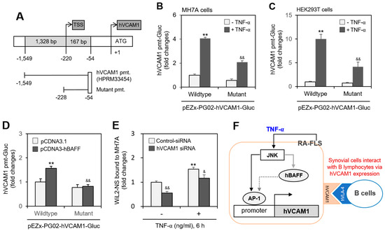 WiL2-NS cell bound to MH7A cells were enhanced by human vascular cell adhesion molecule-1 (hVCAM1) expression. (A–C) Mutant promoter to hVCAM1 was prepared from wild-type promoter (A). MH7A (B) or HEK293T (C) cells were transfected with wild- or mutant-type of pEZx-PG02-hVCAM gaussia luciferase (Gluc) plasmid DNA. Then, each cell was incubated for 30 h after transfection, and treated with 20 ng/mL TNF-α for additional 6 h. Gluc activity was measured by using luminometer (B,C). (D) MH7A cells were co-transfected with pCDNA3.1, or pCDNA3-hBAFF and wild or mutant type of pEZx-PG02-hVCAM-Gluc plasmid DNA by using PEI. Gluc activity was measured by using luminometer. (E) MH7A cells were transfected with control or hVCAM1-siRNA to knockdown hVCAM1 expression by using Lipofectamine® and treated with 20 ng/mL TNF-α for 6 h. Then, WiL2-NS cells were added and co-incubated to adhere for 30 min. Unbound WiL2-NS B cells were washed out and MTT assay was used to analyze bound B cells. Each experiment was performed at least four times. Data in a bar graph represent the means ± SD. ** p < 0.01; significantly different from TNF-α-untreated (B,C) or pCDNA3.1-transfected (D) or control-siRNA-treated and TNF-α-untreated (E) control group. & p < 0.05, && p < 0.01; significantly different from control TNF-α-treated (B,C) or pCDNA3-hBAFF-transfected (D) or control-siRNA-treated and TNF-α-treated (E) control group. (F) This is a schematic interaction mechanism of B lymphocytes to synovial cells by hVCAM1 expression under TNF-α stimulation. It suggests that TNF-α-activated JNK controls hVCAM1 expression via AP-1 binding on its promoter (black solid line) in synovial cells. JNK also might induce hBAFF expression (grey solid line), which lead to the regulation of hVCAM1 expression by AP-1 binding on its promoter (grey dotted line) in synovial cells. Through this molecular mechanism, hVCAM1 can control the interaction of synovial cells to B lymphocytes.