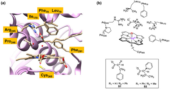 To understand the mechanism of substrate activation by P450 OleTJE enzymes and, in particular, how the enzymes react with fatty acid substrates with phenyl substituents, we decided to create a series of cluster models and study the possible reaction pathways for fatty acid activation by CpdI models. Several previous studies covered the H2O2 activation on a heme center to form CpdI [39,40,41,42], which is the active oxidant that performs the catalysis. Hence, we will focus on the mechanism starting from CpdI and a substrate only. Previous studies of ours showed that large QM cluster models of well over 150 atoms represent the oxidant and substrate binding pockets of enzymes highly accurately and give results at par with QM/MM methods [43,44,45,46]. Therefore, a large QM cluster model of the substrate-bound P450 OleT models was set up. The substrate-bound structure of P450 OleTJE was characterized crystallographically by Belcher et al. [47], and an extract of the 4L40 protein databank file [48] (pdb) is shown in Figure 1. As it can be seen, the heme is linked to the protein through a thiolate linkage of Cys365. The substrate binding pocket is mostly lined with aromatic and aliphatic amino acids including the side chains of Leu78, Phe79, Ile170, Pro246 and Phe291. In the substrate binding pocket, the carboxylate of the icosanoic acid substrate forms a salt bridge with the side chain of Arg245.