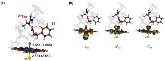 The optimized geometry of our CpdI model with substrate S1 bound (ReS1) is shown in Figure 2a for the doublet and quartet spin states. Geometrically, the doublet and quartet spin state structures are very similar with almost equal Fe–O distances of 1.665 and 1.654 Å and Fe–S interactions of 2.553 and 2.571 Å, respectively. This is not surprising as the two spin states are known to be close in energy [54,55,56,57,58,59,60] in CpdI and have the same orbital occupation with three unpaired electrons in orbitals labeled a2u, π*xz and π*yz (Figure 2b). The a2u orbital is a heme-based orbital that in D4h symmetry has contributions on the pyrrole nitrogen atoms and the meso-carbon atoms. In addition, it mixes strongly with a lone pair orbital on the sulfur atom of the axial ligand, which gives it its oxidative power. The π*xz and π*yz orbitals are the antibonding orbitals along the Fe–O bond. Similar structures and orbital occupations were obtained for the reactant complexes with substrate S2 bound (ReS2). Overall, the reactant structure and electronic configuration match previous computational studies on P450 CpdI excellently and predict similar bond lengths to those seen previously for analogous systems [36,38,51,52,53,54,55,56,57,58,59,60,61,62,63,64,65,66,67,68,69,70,71,72,73,74,75,76,77,78].