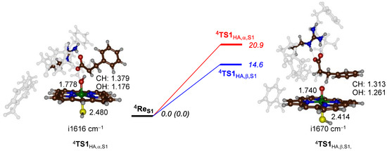 Next, a mechanistic study into 3-phenylpropionate (S1) activation by the CpdI model of P450 OleTJE was performed using model ReS1 leading to decarboxylation, desaturation, α-hydroxylation and β-hydroxylation products, as described above in Scheme 3. These four reaction products all originate from either Cα–H or Cβ–H hydrogen atom abstraction; hence, we will start with the hydrogen atom abstraction steps first. Figure 3 shows the hydrogen atom abstraction transition state structures TS1HA,α,S1 and TS1HA,β,S1 as geometries optimized with density functional theory methods. In addition, the middle panel of Figure 3 shows the energy profile for relative enthalpies (ΔE+ZPE; ZPE = zero-point energy). The Cβ–H hydrogen atom abstraction barrier is considerably lower in energy than the Cα–H hydrogen atom abstraction barrier: ΔE+ZPE = 14.6 kcal mol−1 for TS1HA,β,S1 and ΔE+ZPE = 20.9 kcal mol−1 for TS1HA,α,S1. Therefore, S1 activation by CpdI of P450 OleTJE will give dominant products from Cβ–H activation. The barrier for TS1HA,β,S1 is close in energy to the one calculated by a minimal cluster model without protein residues for Cβ–H activation of propane or the activation of the methyl C–H bond of trans-methyl-phenylcyclopropane [82,83,84]. The fact that the barrier TS1HA,α,S1 is much higher in energy than those barriers obtained with the minimal model and trans-methyl-phenylcyclopropane means that the second coordination sphere of the enzyme, i.e., the substrate binding pocket, restricts the substrate positioning and hampers Cα–H hydrogen atom abstraction dramatically, raising it in energy.