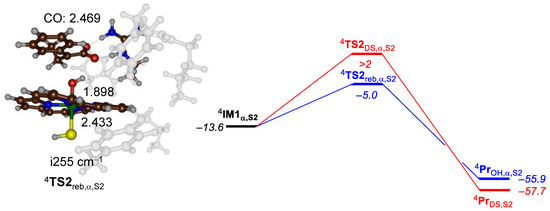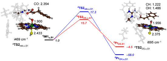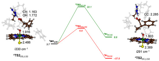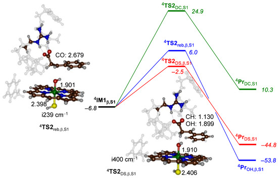 The transition states have typical features of OH rebound and desaturation barriers and match previous work on substrate hydroxylation and desaturation by P450 enzymes [36,38,51,52,53,64,65,66,67,68,69,72,79,88,89]. The rebound transition state has a long C–O distance of 2.354 Å, although the imaginary frequency (i469 cm−1) is clearly a pure C–O stretch vibration. As a matter of fact, a series of rebound calculations by biomimetic iron(III)–hydroxo and manganese(III)–hydroxo complexes have similarly long C–O bonds in the transition states [90,91]. In the transition state, the Fe–O bond further elongates to 1.900 Å. In the desaturation transition state TS2DS,α,S1, the same thing happens, and Fe–O elongates to 1.956 Å. Interestingly, the desaturation transition state is more reactant-like, with a shorter C–H (1.222 Å) than O–H (1.486 Å) distance.