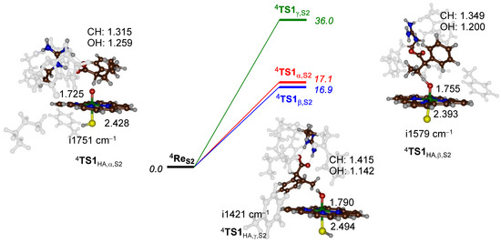 The optimized geometries of 4TS1HA,α,S2, 4TS1HA,β,S2 and 4TS1HA,γ,S2 are presented alongside the landscape in Figure 6. All three structures have their Fe–S distances in the window from 2.393 to 2.494 Å, while the Fe–O distance ranges from 1.725 for 4TS1HA,α,S2 to 1.790 Å for 4TS1HA,β,S2. All three transition states are product-like, with shorter O–H than C–H distances. Moreover, they are all characterized with a large imaginary frequency that implies a significant amount of tunneling will take place and probably the kinetics will be affected by isotopic substitution of hydrogen atoms by deuterium in the substrate.
