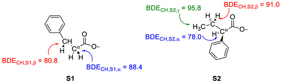 To understand the difference in hydrogen atom abstraction barriers between the two substrates, we calculated C–H bond dissociation energies (BDEs) for isolated substrates in the gas phase at the B3LYP/6-311++G** level of theory (with a solvent model included). These BDEs were calculated from the adiabatic homolytic bond strengths as the difference in energy (ΔE+ZPE) of the substrate, a hydrogen atom and the substrate with a hydrogen atom removed. Previously, we showed that hydrogen atom abstraction barriers often correlate with the BDE of the substrate C–H bond that is broken [92,93,94], Figure 9. For substrate S1, the Cα–H bond has a BDECH, S1,α = 88.4 kcal mol−1, while the Cβ–H bond has a strength of 80.8 kcal mol−1. As such, the Cβ–H bond is the weakest bond in the substrate and the most likely bond to be activated by the enzyme. Indeed, our potential energy landscape (Figure 3) for S1 activation by P450 OleTJE gives a lower hydrogen atom abstraction barrier for Cβ–H than for Cα–H, in line with the differences in the bond strengths of the two bonds in the substrate. Clearly, the protein pocket does not affect the selectivity of the reaction, and P450 OleTJE appears to abstract the weakest C–H bond of the substrate.