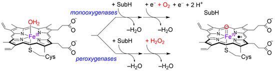 Reaction mechanism for the formation of the active species in cytochrome P450 enzymes (Compound I) in monooxygenases using dioxygen (top reaction) or in peroxygenases using H2O2 (lower reaction); SubH is the substrate.