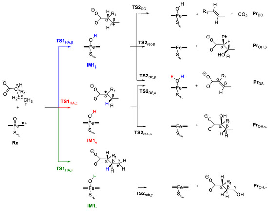 Next, we explored the substrate activation channels of S1 and S2 by CpdI, and the details of the explored reaction mechanisms are shown in Scheme 3 with the designated labeling of the individual structures. Thus, structures related to substrate S1 have S1 in subscript after the label, while those associated with substrate S2 have S2 in subscript after the label. In particular, we tested the activation of the Cα–H and Cβ–H bonds of both substrates, while for S2, we also investigated the products originating from Cγ–H activation. These reaction pathways start with an initial hydrogen atom abstraction from either the Cα–H, Cβ–H or Cγ–H (if applicable) positions via transition states TS1HA,α, TS1HA,β and TS1HA,γ to form the radical intermediates designated IM1α, IM1β and IM1γ. As it is usually seen in substrate hydroxylation pathways [55,79,80], an OH rebound barrier via TS2reb,α, TS2reb,β or TS2reb,γ then gives Cα hydroxylation, Cβ hydroxylation and Cγ hydroxylation products (PrOH,α, PrOH,β and PrOH,γ), respectively. In addition, from either IM1α or IM1β a second hydrogen atom abstraction can take place via transition states TS2DS,α and TS2DS,β to form a double bond along the Cα–Cβ bond and give a desaturated product (PrDS). A final mechanism through substrate decarboxylation is only possible from IM1β via transition state TS2DC to form CO2, olefin and an iron(III)–hydroxo(heme) complex, PrDC. We investigated all these individual reaction pathways for the cluster model Re with substrates S1 and S2 bound in the quartet spin state as previous work showed the quartet spin state to be the most sensitive to bifurcation pathways [52,81].