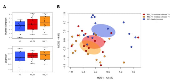 The gut microbiota diversity of multiple sclerosis patients before and after the rehabilitation program compared to healthy subjects. (A) Boxplots showing the distribution of alpha diversity, measured using the Inverse Simpson (top) and Shannon (bottom) indices, for the gut microbiota of multiple sclerosis patients before (MS_T0, red) and after the rehabilitation program (MS_T1, orange), as well as for age- and sex-matched healthy subjects across Italy (HC, blue). (B) Principal Coordinates Analysis (PCoA) of the gut microbial communities, based on the Jaccard similarity index. Significant segregation between study groups was found (p < 1 × 10−4, permutation test with pseudo-F ratios).