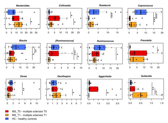 When focusing on the taxonomic variations in the gut microbiota of MS_T0 compared to HC (Figure 2, Figures S4 and S5), we found significantly reduced levels of Firmicutes in the former (mean relative abundance ± sem in MS_T0 vs. HC, 59.8% ± 3.3% vs. 79.0% ± 3.0%; p = 0.005, Wilcoxon test), together with increased proportions of Bacteroidetes (19.1% ± 2.4% vs. 11.0% ± 2.7%; p = 0.03), Actinobacteria (14.7% ± 2.4% vs. 7.0% ± 1.5%; p = 0.008) and Proteobacteria (4.5% ± 1.9% vs. 0.5% ± 0.3%; p = 0.003). At family level, the MS-associated gut microbiota was significantly depleted of the typical dominant families Lachnospiraceae (18.1% ± 2.0% vs. 35.1% ± 4.9%; p = 0.002) and Ruminococcaceae (20.4% ± 2.3% vs. 30.6% ± 4.0%; p = 0.05), while enriched in Coriobacteriaceae (9.5% ± 1.8% vs. 1.4 ± 0.4%; p = 0.0008), Veillonellaceae (5.3% ± 1.5% vs. 0.9% ± 0.3%; p = 0.02), Prevotellaceae (5.9% ± 1.9% vs. 1.2% ± 1.2%; p = 0.02) and Enterobacteriaceae (4.1% ± 1.9% vs. 0.3% ± 0.2%; p = 0.04). In agreement with our previous work and currently available literature [16,25,26], the genus-level gut microbiota layout of MS_T0 showed several dysbiotic signs, including a dramatic depletion of SCFA-producing genera, such as Roseburia, Coprococcus and Blautia (p ≤ 0.002), and an increase in Collinsella (8.7-fold) and Prevotella (4.5-fold) (p ≤ 0.02), compared to HC (Figure 2). Both Collinsella and Prevotella have previously been associated with autoimmune disorders and increased levels of IL-17A [27,28].