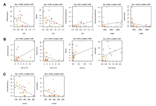 Associations between genus-level relative abundances and levels of LPS and I-FABP (A), lymphocytes subpopulations (B), and cortisol (C) in multiple sclerosis patients over the rehabilitation program. Only statistically significant correlations (p ≤ 0.05) with an absolute Kendall rank correlation coefficient ≥0.3 for genera with relative abundance ≥1% are shown.