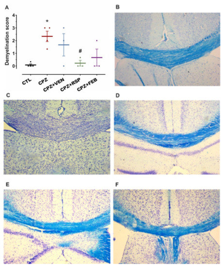 Myelin integrity in mice corpus callosum (CC) after 5 weeks of treatment; staining with Luxol Fast Blue (LFB) and cresyl violet (CV). (A) Variation in demyelination score between treated groups. (B) CTL, (C) CPZ, (D) CPZ + VEN, (E) CPZ + RSP, (F) CPZ + FEB. Data are presented as means ± standard error mean (S.E.M). CTL—control (n = 4); CPZ—cuprizone 400 mg·kg−1 (n = 4); CPZ + VEN—cuprizone 400 mg·kg−1 and venlafaxine 60 mg·kg−1 (n = 3); CPZ + RSP—cuprizone 400 mg·kg−1 and risperidone 2 mg·kg−1 (n = 3); CPZ + FEB—cuprizone 400 mg·kg−1 and febuxostat 5 mg·kg−1 (n = 3). * p < 0.05 vs. CTL; # p < 0.05 vs. CPZ.