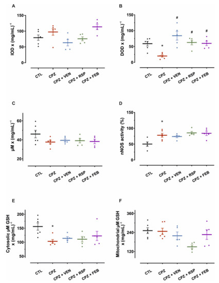 Results from biochemical assays of mouse brain homogenates. (A) Susceptibility to lipid peroxidation of the mitochondrial membrane, determined with DPPP method—percentage increase of optical density (IOD) reported to protein content, after 5 min. (B) Effects of 5-week treatments on mouse brain SOD activity—percentage decrease in optical density (DOD) reported to protein content. (C) Variation of total nitrites in mouse brain tissues—modified Griess method. No significant variations of total nitrites were observed between groups. (D) nNOS activity (percentage increase of total nitrites when nNOS activity is assessed). (E) Cerebral cytosolic total thiols concentrations, expressed as glutathione (GSH) equivalents to protein ratio. (F) Mitochondrial total thiols. Data are presented as means ± S.E.M. CTL—control (n = 6); CPZ—cuprizone 400 mg·kg−1 (n = 6); CPZ + VEN—cuprizone 400 mg·kg−1 and venlafaxine 60 mg·kg−1 (n = 5); CPZ + RSP—cuprizone 400 mg·kg−1 and risperidone 2 mg·kg−1 (n = 5); CPZ + FEB—cuprizone 400 mg·kg−1 and febuxostat 5 mg·kg−1 (n = 5). * p < 0.05 vs. CTL; # p < 0.05 vs. CPZ.