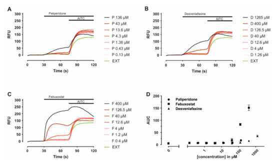 Paliperidone, desvenlafaxine and febuxostat effects in hTRPA1 expressing HEK293T cells. (A–C) Individual time courses of fluorescence displayed as means of 3 replicates for each given concentration. (D) Area under the curve calculated for the interval 30–70 s, reflecting the addition of the compounds until the addition of AITC.