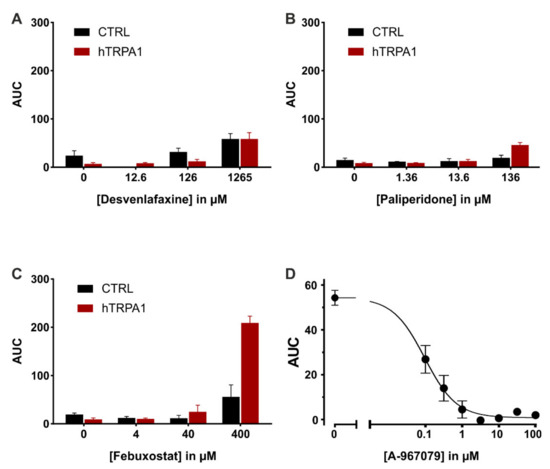 Direct effects of paliperidone, febuxostat and desvenlafaxine in hTRPA1-transfected compared to non-transfected HEK293T cells. (A–C) Areas under the curve calculated for the application period of each compound, in hTRPA1 expressing HEK293T cells (in red), and in untransfected cells (in black). Data are displayed as the mean of four replicates each ± S.E.M. (D) Three-parameter logistic fit of the inhibitory effect of the TRPA1 antagonist A-967079 against febuxostat 126 µM. Data are displayed as mean ± S.E.M. of 6 replicates each.