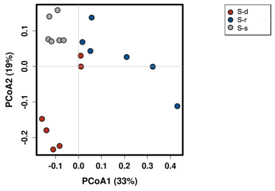 Principal Coordinates Analysis (PCoA) plots of Bray-Curtis distances between S-deprived (S-d), S-resupplied (S-r), and S-supplied (S-s) plants with the percentage variance explained by the principal coordinates.