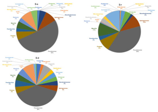 Pie charts showing bacteria genera abundance expressed as a percentage over the total detected in S-supplied (S-s), S-resupplied (S-r), and S-deprived (S-d) plants.