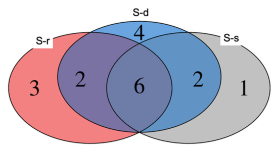 Venn diagram showing the number of shared and exclusive OTUs. Areas 1, 3, and 4 represent OTUs found exclusively in S-supplied (S-s), S-resupplied (S-r,), and S-deprived (S-d) plants, respectively. Overlapping area 6 represents the OTUs in common between all treatments.