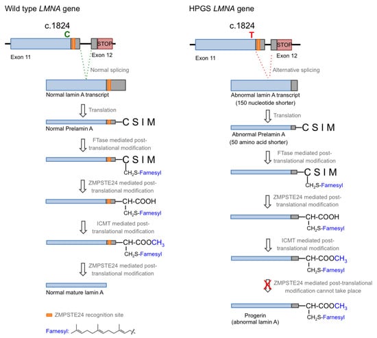 Hutchison–Gilford progeria syndrome (HGPS), or progeria, is a rare human genetic disorder caused by a specific mutation in the LMNA gene, which codes for lamins A and C. This autosomal dominant disease is triggered by the single nucleotide substitution mutation c.1824C > T in exon 11. Although this mutation should not entail any consequence since both nucleotide triplets (wild type and mutant) code for glycine (p.G608G mutation), the mutation activates a cryptic donor splicing site for lamin A-specific transcript processing, leaving the splicing for the lamin C transcript unaffected (see Figure 1 for details) [,,]. The appearance of this new splicing site in the lamin A gene leads to the generation of a messenger RNA with a missing part, resulting in the production of a mutated form of lamin A, which is called progerin. Progerin lacks 50 amino acid residues encoded by the lost fragment in exon 11. This deletion is critical because it contains a recognition site for ZMPSTE24 cysteine proteinase, which is involved in the last step of the post-translational processing of prelamin A protein. In normal cells, prelamin A, as expected from the CAAX sequence in its C-terminus, is subjected to a specific set of post-translational modifications. These transformations include the following stages: (i) farnesylation of the cysteine residue; (ii) cleavage of the AAX terminal tripeptide; (iii) carboxymethylation of the C-terminal cysteine; and (iv) final excision of the last 15 amino acids due to the existence of a specific recognition site. The first step is catalyzed by the enzyme farnesyl transferase (FTase), the two hydrolytic events are mediated by ZMPSTE24, and the methylation reaction is carried out by isoprenylcysteine carboxylmethyltransferase (ICMT). In progerin, once the methylation step has occurred, the last peptide removal cannot occur due to the lack of the ZMPSTE24 recognition site, so the produced protein is a 15 amino acid longer, permanently farnesylated and methylated version of lamin A (Figure 1) [].