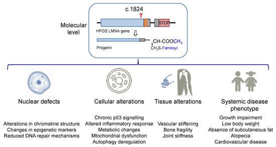 Alterations in HGPS individuals from the molecular and cellular levels to the disease phenotype.
