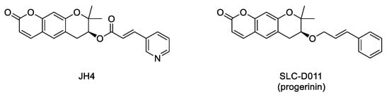 Interaction between progerin and lamin A has been established as critical for the development of the senescence phenotype associated with HGPS cells. Hence, it is conceivable that an inhibitor of this protein–protein interaction could improve the progeroid phenotype. Within this aim, an ELISA-based screening was carried out to identify progerin–lamin A interaction inhibitors. This first study succeeded in the characterization of JH4 (Figure 5) as a potent and specific inhibitor of this interaction. This compound improved nuclear deformation and senescence markers of progeroid cells. Remarkably, its administration (10 mg/Kg, intraperitoneally, twice a week) to LmnaG609G/G609G progeroid mice significantly ameliorated some of the characteristic features of progeria, including increase of body weight, grab strength, skin thickness, and improved nuclear deformation. In addition, administration of JH4 was able to extend lifespan in progeroid mice and to restore senescence-related markers []. However, the compound half-life after oral administration was very short. Therefore, the search for new inhibitors of the interaction between progerin and lamin A with optimized pharmacokinetic properties continued until the identification of SLC-D011 or progerinin (Figure 5), a compound able to extend the life span of LmnaG609G/G609G progeroid mice after oral administration (50 mg/Kg, daily) and to improve histological and physiological hallmarks of progeria in Lmna+/G609G mice [,].