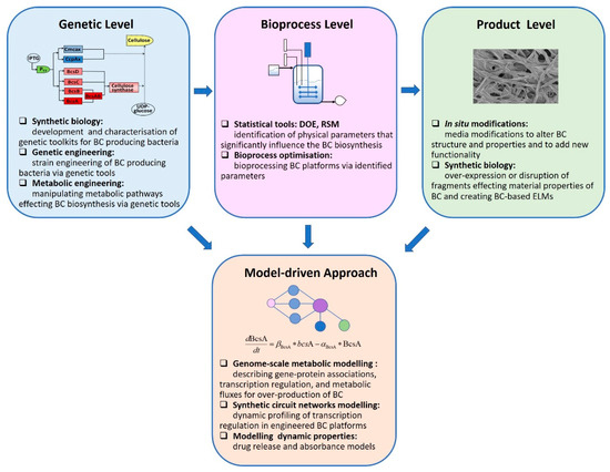 For many decades, the studies mostly concentrated on the optimization of cellulose production through modification of culturing strategies and conditions. Different medium components and additives (ethanol, vitamins, agar, sodium alginate), culturing conditions (pH, temperature, dissolved oxygen), and fermentation techniques (static, agitated, bioreactors) have been studied [3,4]. More recently, intensive studies have focused on strain engineering, manipulating the cellulose biosynthesis pathway, and improving BC functionality. Researchers are exploring new strategies via synthetic biology, metabolic engineering, bioprocess engineering, and model-driven approaches. In this review, we discuss and present the recent progress on BC biosynthesis categorizing at different levels: genetic level, bioprocess level, and product level as well as modeling approaches targeting each level (Figure 1).