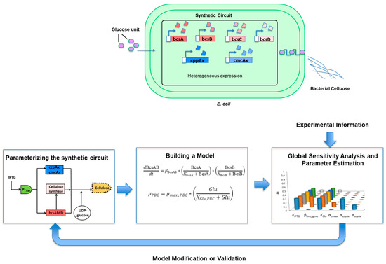 Sustainable growth of cell factory development requires not only genome-scale models but also dynamic prediction and scalability of bioprocesses. The typical steady-state assumption entailed ignores dynamic reality, often limiting the applicability of genome-scale models. Successful activation of metabolic networks relies on transcriptional regulation initiating the appropriate metabolic cascades. Prediction of this non-linear dynamic systems behaviour, such as that of engineered gene circuits, has been enabled through rapid advances in model-based designs. Tsipa et al. (2018) developed a systematic bioprocess design tool with high predictive power by linking kinetic gene regulatory network modeling to microbial growth kinetics using consistent gene expression (mRNA) data [76]. This design tool applied to engineered E. coli cellulose biosynthesis gene circuit developed by the same research group (Figure 2). The model resulted in dynamic profiling of mRNA gene expression, estimation of enzymes and protein synthesis, and prediction of cellulose biosynthesis. It considers heterogeneous cell populations, caused by the metabolic responses of the host microorganism, and predicts substrate utilization and biomass growth patterns. GSA of the hybrid framework revealed significant parameters associated with gene expression, glucose degradation, and biomass and product formation. Specifically, if the translation efficiencies of Cmcax, CcpAx, BcsC, BcsD, and cellulose synthase were modified, the cellulose biosynthesis would be significantly affected. Furthermore, an increase in plasmid instability would affect glucose degradation and biomass growth patterns and, subsequently, cellulose biosynthesis because of its coupling to microbial growth [77].