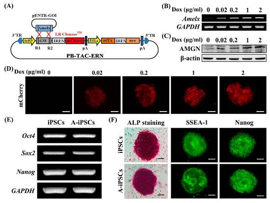 The Dox-inducible Amelx-expressing piggyBac vector with a reporter gene (mCherry) is shown in Figure 1A. Expression of Amelx and mCherry was induced in Amelx-iPSCs by Dox treatment at different concentrations for 24 h. We chose 1 μg/mL Dox to induce Amelx expression according to the observed peak expression of Amelx and AMGN (Figure 1B–D). Amelx-iPSCs possessed high pluripotency at nearly the same level as the original iPSCs, according to the expression of endogenous stem cell markers (octamer-binding transcription factor 4 (Oct4), SRY-box 2 (Sox2), and Nanog) by semi-quantitative reverse transcription polymerase chain reaction (RT-PCR) (Figure 1E), alkaline phosphatase (ALP) staining, and protein expression of stage-specific embryonic antigen-1 (SSEA-1) and Nanog (Figure 1F).