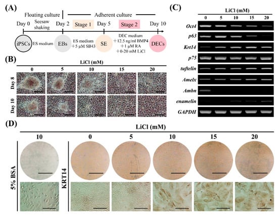 Effects of LiCl concentration on dental epithelial cell (DEC) induction. (A) Diagram of DEC induction from Amelx-iPSCs. After surface ectoderm (SE) induction (stage 1) by SB43 (nodal signaling inhibitor), the cells were treated with BMP4, RA, and LiCl (Wnt/β-catenin pathway activator: 0–20 mM) in DEC medium for DEC induction (stage 2). (B) Cell morphology at days 8 and 10 during stage 2 of induction. Scale bars: 200 μm. (C) Gene expression of stemness (Oct4), proliferative epithelium (p63), DEC (Krt14, p75, and tuftelin), and ameloblast (Amelx, Ambn, and enamelin) markers as determined by semi-quantitative RT-PCR analysis after stage 2 (on day 10). (D) Immunocytochemistry for KRT14 (dental epithelial marker) after stage 2 (on day 10). Scale bars: 1 cm and 100 μm for upper and lower panels, respectively.