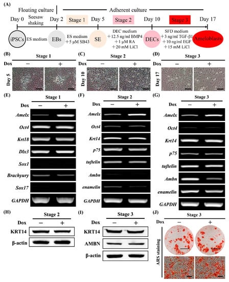 Effects of stage-specific transcriptional activation of Amelx on ameloblast differentiation of Amelx-iPSCs. (A) Diagram of the established stepwise induction protocol. (B–D) Cell morphology of Amelx-iPSCs on day 5 (B), 10 (C), and 17 (D) with or without Dox treatment during stage 1 (B), stage 2 (C) or stage 3 (D). Scale bars: 200 μm. (E–G) Gene expression of stemness (Oct4), surface ectoderm (Krt18), non-neural ectoderm (Dlx3), neural ectoderm (Sox1), mesoderm (Brachyury), endoderm (Sox17) DEC (Krt14, p75, and tuftelin), and ameloblast (Amelx, Ambn, and enamelin) markers in Amelx-iPSCs on day 5 (E), 10 (F), and 17 (G) with or without Dox treatment during stage 1 (E), stage 2 (F), or stage 3 (G) as determined by semi-quantitative RT-PCR analysis. (H-I) Expression of KRT14 and AMBN in Amelx-iPSCs on day 10 (H) and 17 (I) with or without Dox treatment during stage 2 (H) or stage 3 (I) as determined by Western blotting. β-actin was used as an internal control. (J) Alizarin Red S (ARS) staining on day 17 for Amelx-iPSCs with or without Dox treatment during stage 3. Scale bars: 1 cm and 100 μm for upper and lower panels, respectively.