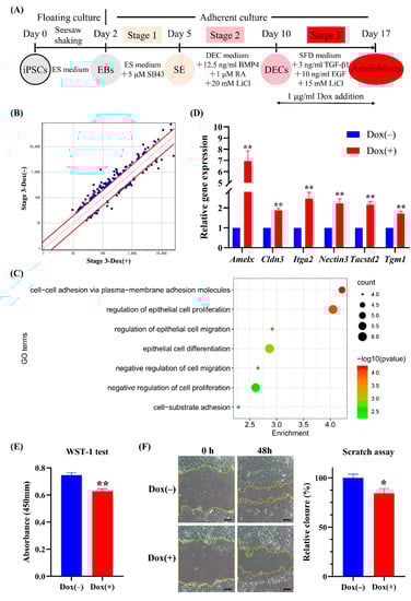 Effects of transcriptional activation of Amelx in Amelx-iPSCs at stage 3 by microarray analysis. (A) Diagram of induction protocol. Using the established stepwise ameloblast induction from Amelx-iPSCs, 1 μg/mL doxycycline (Dox) was added to the induction medium during stage 3, and microarray analysis was performed after stage 3 (on day 17). (B) Scatter diagram of differentially expressed genes (DEGs) identified by microarray analysis. (C) Gene ontology (GO) terms associated with the upregulated DEGs. (D) Verification of six upregulated DEGs (Amelx, Cldn3, Itga2, Nectin3, Tacstd2, and Tgm1) by real-time RT-PCR. ** p < 0.01 (t-test; n = 3). (E) Cell proliferation measured by the WST-1 assay on day 17. ** p < 0.01 (t-test; n = 3). (F) Representative images and quantification of scratch assay for evaluation of cell migration. Scratch assay was performed on day 13 at stage 3. The cell migration was measured at 0 and 48 h after cell scraping. Scale bars: 200 μm. * p < 0.05 (t-test; n = 3).