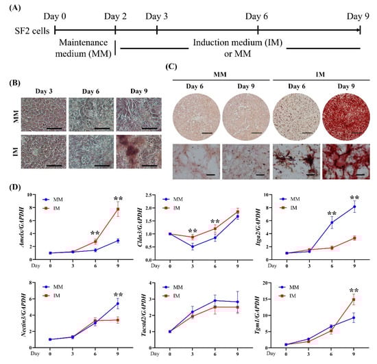 Verification of the upregulated DEGs in a rat dental epithelial cell line (SF2 cells). (A) Diagram of SF2 cell induction toward ameloblasts. (B) Cell morphology at days 3, 6, and 9. Scale bar: 100 μm. (C) Alizarin Red S staining at days 6 and 9. Scale bars: 5 mm and 200 μm for upper and lower panels, respectively. (D) Expression pattern of the upregulated DEGs during ameloblast differentiation of SF2 cells as determined by real-time RT-PCR analysis. Significant differences (** p < 0.01: two-way ANOVA with Sidak’s test; n = 3) were evaluated with respect to the values between MM and IM at each time point.