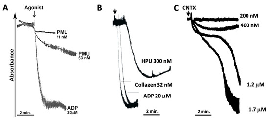 The method described in [31] was followed. Briefly, PRP aliquots (300 µL) were pre-incubated (2 min, 37 °C under stirring), and then a maximum of 30 µL of agonist was added. Aggregation of platelets was registered during 5 min in a Lumi-Aggregometer (Chrono-log Corporation, Havertown, PA, USA). The aggregation assays were performed with 11 or 63 nM of PMU. Adenosine diphosphate (ADP) at 20 µM was used as a positive control. Buffer alone was employed as the negative control.