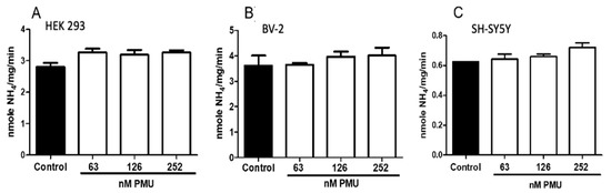 Accumulation of ammonia in the medium of cells cultured in the presence of PMU. Cultured cells (A) kidney, HEK293, (B) murine microglia, BV-2, and (C) human neuroblastoma, SH-SY5Y, were incubated at 37 °C for 24 h with 20 mM sodium phosphate buffer pH 7.0 (NaPB 7.0) (control), or PMU at 63, 126 or 252 nM concentrations. The levels of ammonia accumulated in the cultures’ supernatants were monitored by a colorimetric assay. The results are expressed in nanomoles NH4/mg cell protein/min. Results are expressed as mean ± SEM (n = 9–12 for the control and 9–14 for treatments). The data were analyzed by one-way parametric ANOVA with a Dunnett post-test.